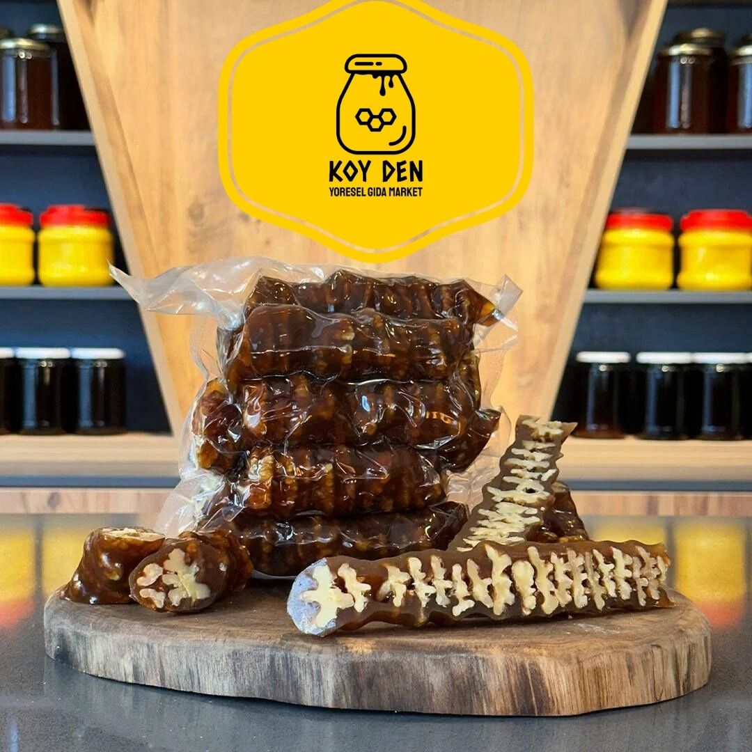 Köyden Yöresel Cevizli Sucuk, doğal malzemelerle hazırlanmış, zengin besin değerlerine sahip ve geleneksel bir lezzettir. Sağlıklı, lezzetli ve çok yönlü kullanımları ile mutfaklarınıza değer katacaktır.